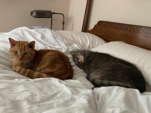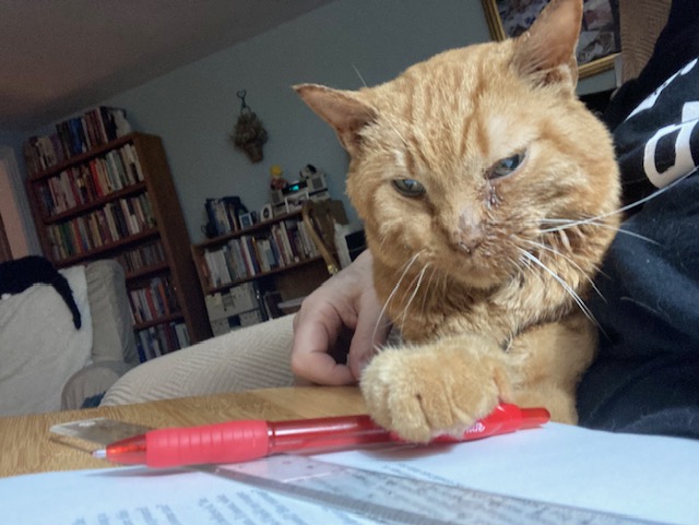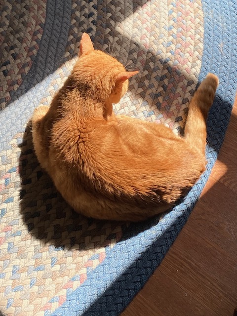 My timing was excellent. In fact, it turns out a number of people were late today, so Ned and I were just a few of tardy ones. Ned behaved beautifully during the service. When he meowed very softly, I opened the carrier door and petted him, and that was all he wanted. Afterward, the woman behind me said, “Your cat was very good.” Is, I thought. Ned is good.