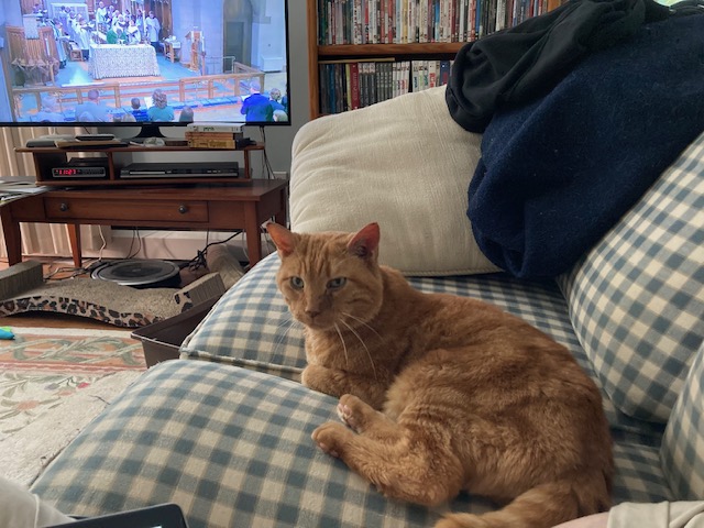 And so, Ned went to church today. I made a point of being slightly late, because the choir occupies the back pews until it’s time for them to process up the aisle to the chancel, and I wanted to sit in the back in case Ned started meowing and we needed to slip out. Over the summer, he would stand in my office doorway, meowing for afternoon snacks, until the client I was on the phone with would say, “Shut up, Ned!” His meow has gotten much quieter in the past week, but I didn’t want to take any chances.