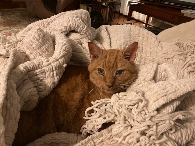 Yes, Ned is a cat. But God loves cats, too. I know this for a fact, because curled up in a basket just a few feet away is a skinny, sickly, old orange cat—a wonderful, goofy, kindhearted, once-playful, still-loving boy—who, on the eve of his final journey, was blessed by a priest who wept over him as she pronounced God’s love and favor upon him.