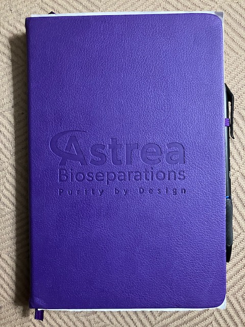 So I did the only thing I could: I made notes. A lovely neighbor on Buy Nothing had chosen me to receive a purple journal with lined pages and a ribbon to keep my place. (I neither know nor care what bioseparations are, so the company name engraved on the cover is irrelevant except insofar as it means that these people, whoever they are, place appropriate value on nice writing materials.) When I’ve had thoughts and the notebook isn’t handy, I jot them on whatever’s around—the church worship bulletin, a page from the page-a-day New Yorker calendar. Eventually, I learned simply to carry the journal with me, which is how it came to be that this morning, as I listened to the sermon, I was able to take out my journal and jot down a couple lines of dialogue before I lost them.
