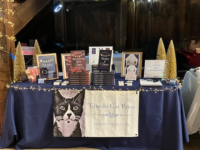 - Offer freebies. I put out stacks of bookmarks for both State v. Claus and Becoming Mrs. Claus. On one side is the book’s cover and some gold decorations; on the other side is the Tuxedo Cat Press logo, together with the website address and a QR code. People love to take bookmarks even if they’re not buying a book, and I’m happy to give them out because who knows when they’ll pick it up and think, “I remember meeting this author. I wonder what her book is about?” Also, I offer candy because that’s what Santa would do. (Note: if you’re going the candy route, make sure it won’t melt. Once, I took Hershey’s chocolate kisses to an event where it turned out we were in the August sun with no tent, and you can guess how that turned out.) At the holidays, I offer candy canes, and in the spring and summer, I have peppermints—all individually wrapped, of course, because who wants to dip into a dish of M&Ms after that kid with the runny nose? (I also place a bottle of hand sanitizer next to my email signup list, and people use it.)