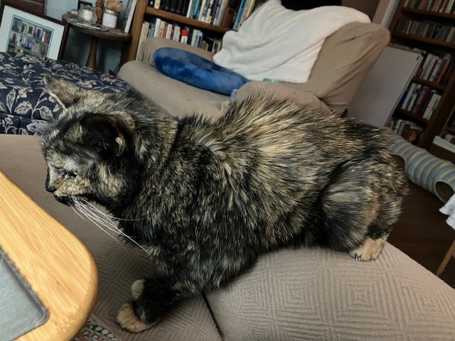 Stella has taken to cuddling tightly up against me at night. This is a recent and surprising development, especially considering how much she yells at me, Danny, and everybody else who has the temerity to draw near. She spends much of her day sleeping in a bed in the kitchen that sits on the board that rests atop the covered litter boxes. I put the board across there long ago so the cats could sit there and look out the window onto the front porch. Charlotte occasionally uses this perch to watch birds, but now that Stella has claimed it, nobody else goes up there.